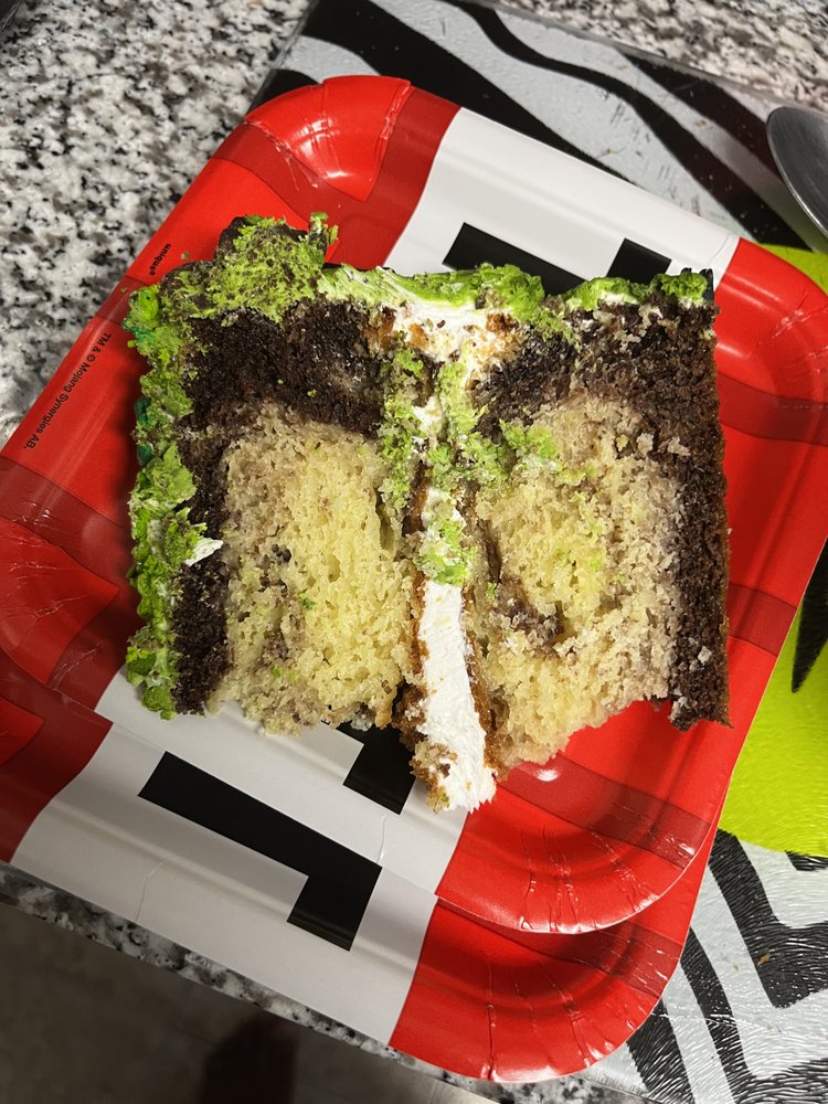 Triple chocolate cake topped with white buttercream icing, Oreo crumbs, chocolate drizzle, and orea cookie.